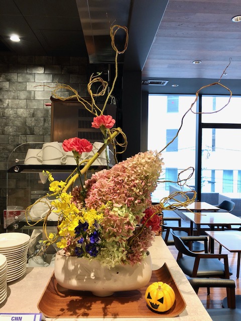 (ダイワロイネットホテル内、カフェテラスロイにて。ハローウインをいける第2弾。なんとバスケットボールほどの特大の秋色あじさいをいけました!)