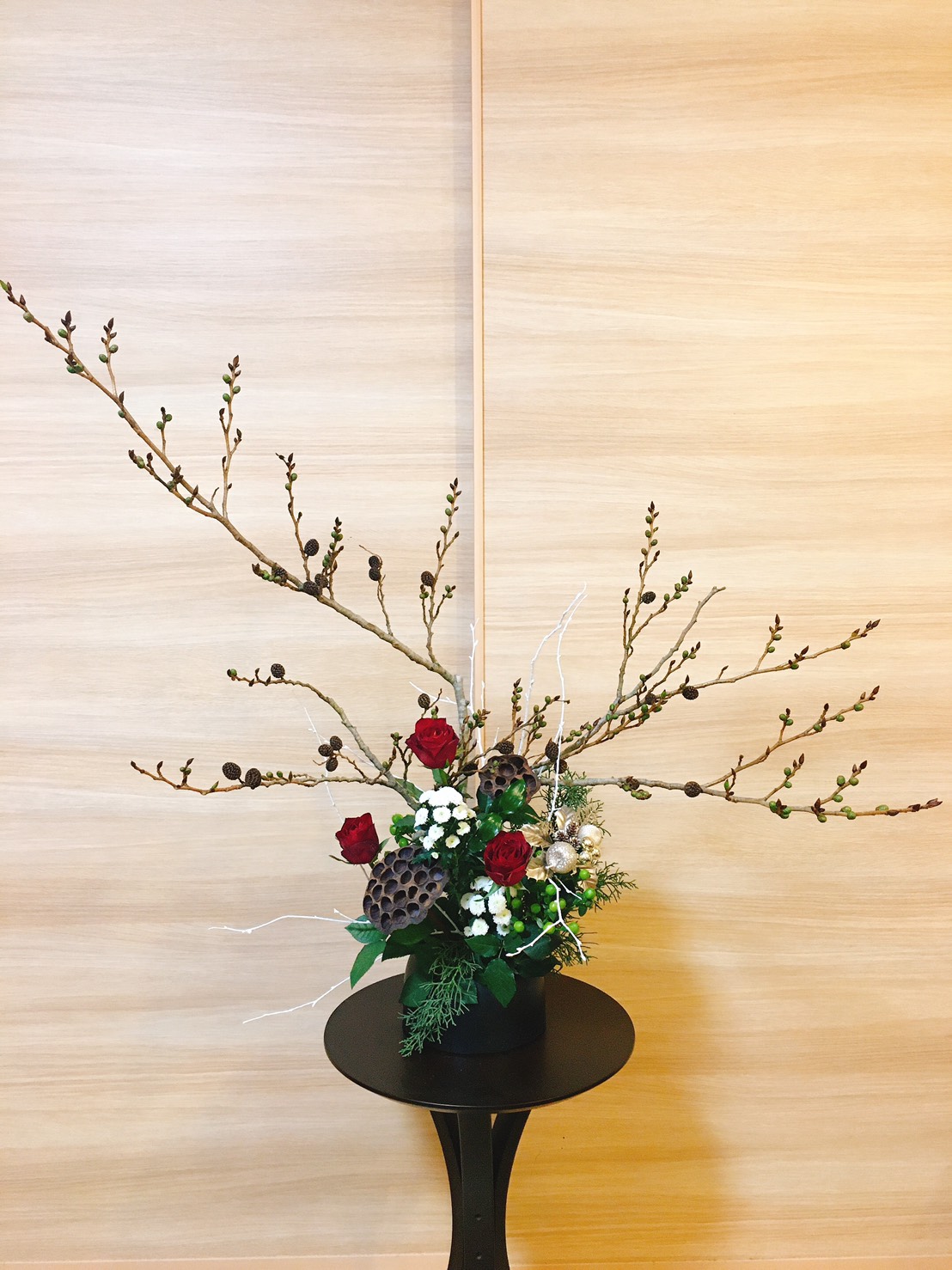 同じ花材を使っても、盛花、投げ入れ、器、バックの色・・・、様々な条件とその方の個性で作品は変わります。それが草月流のとっても楽しいところです。みなさん真剣に花と遊び、それぞれの花を作り、素敵なクリスマスの夜を飾ります。
